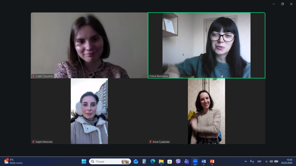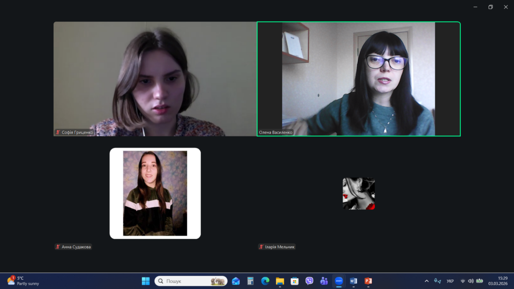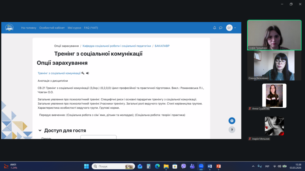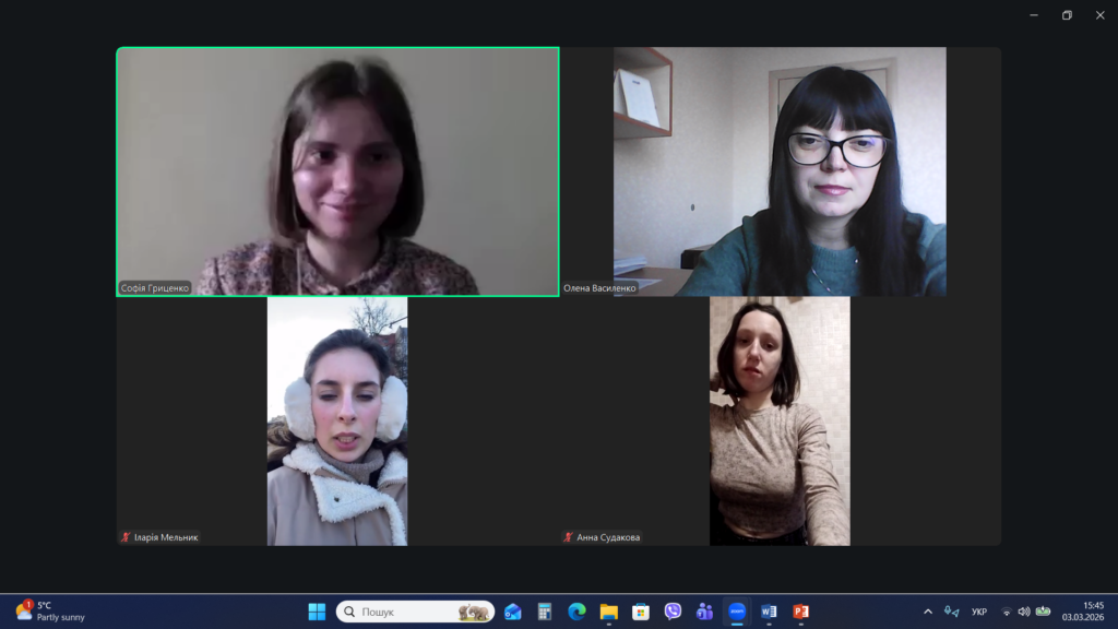 Під час цієї зустрічі Олена Василенко познайомила здобувачів вищої освіти з особливостями навчального процесу у Хмельницькому національному університеті, детально розглянувши можливості використання Електронного університету та Модульного середовища для навчання. Також лекторка представила опис дисципліни «Тренінг з соціальної комунікації», види навчальних завдань з дисципліни та критерії їх оцінювання.