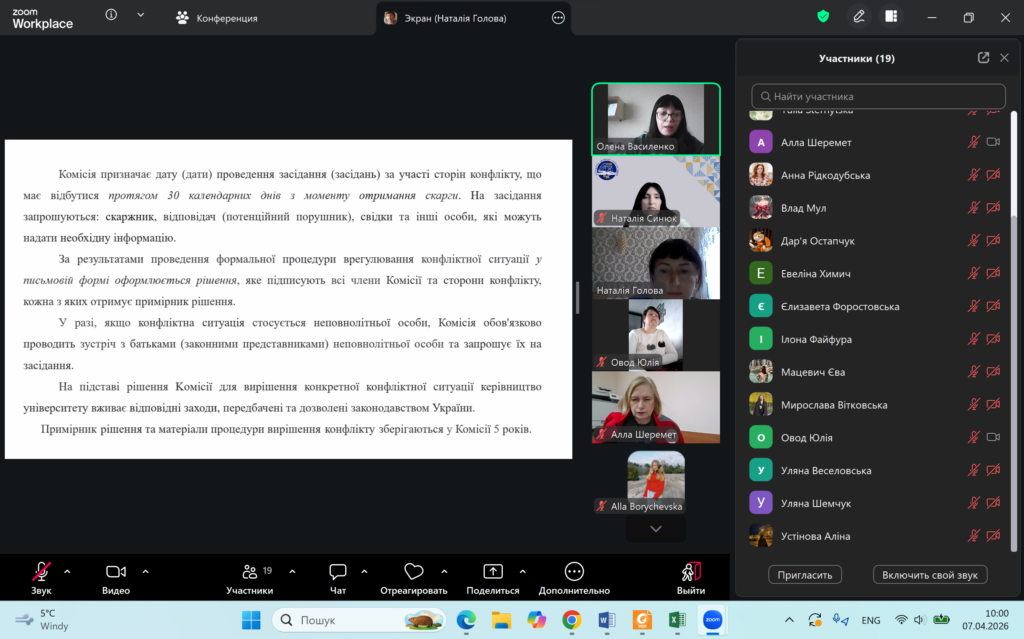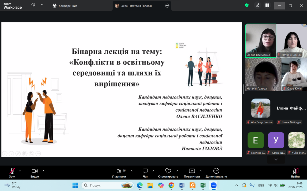 7 квітня 2026 р. на кафедрі соціальної роботи і соціальної педагогіки була проведена бінарна лекція на тему «Конфлікти в освітньому середовищі та шляхи їх вирішення». Лекцію провели завідувач кафедри, канд. пед. наук, доцент Олена Василенко та канд. пед. наук., доцент Наталія Голова.
