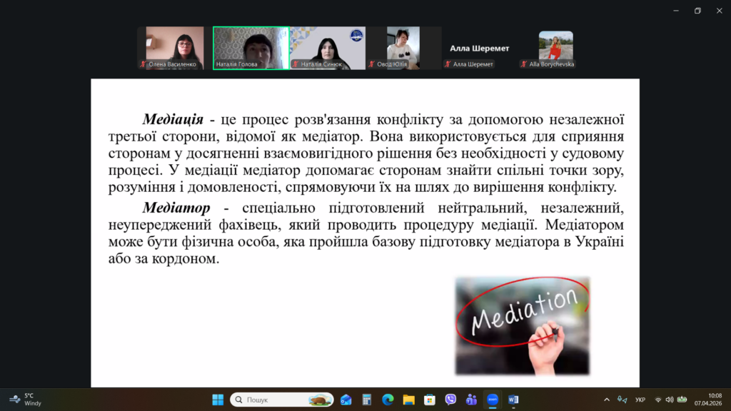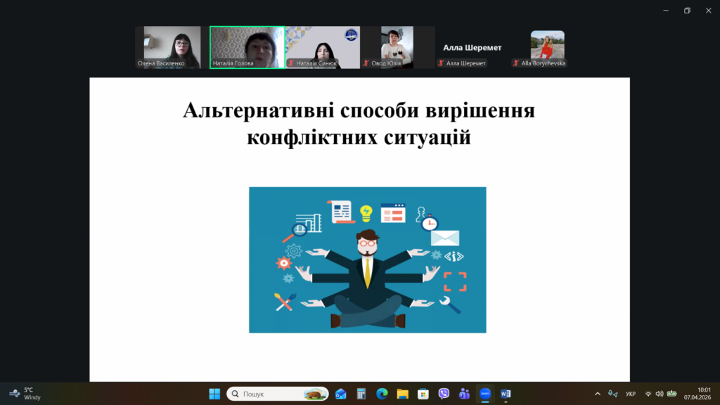 Лектор Наталія Голова продовжила виклад матеріалу лекції та розглянула альтернативні способи вирішення конфліктних ситуацій, зокрема такі, як: переговори, медіація та арбітраж. Спікер звернула увагу присутніх на те, що на сьогоднішній день найбільш поширеним способом вирішення конфліктної ситуації є медіація як процес розв’язання конфлікту за допомогою незалежної третьої сторони, відомої як медіатор. Наталія Голова охарактеризувала особливості проведення медіації, основні принципи медіації, елементи складання медіаційної угоди тощо. Наприкинці лекції спікер надала поради щодо ефективного розв’язання конфліктів.