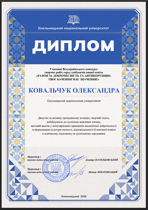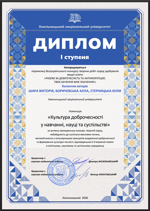 • 2 квітня на завершення проведення Декади академічної доброчесності здобувачі кафедри, які є членами студентського наукового гуртка «Науковий супровід соціальних проєктів» (керівник – канд. пед. наук, доцент Наталія Синюк) були нагородженні Дипломом І ступеня за перемогу у Всеукраїнському конкурсі творчих робіт здобувачів вищої освіти «Разом за доброчесність та антикорупцію. Твоє бачення має значення!».
