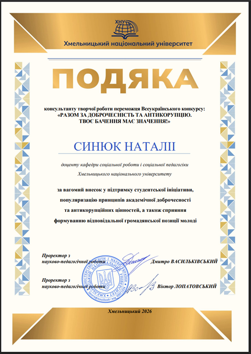 З 24 березня по 2 квітня 2026 року в Хмельницькому національному університеті була проведена Декада академічної доброчесності. Колектив кафедри соціальної роботи і соціальної педагогіки взяв активну участь у низці заходів, що проводилися в університеті: