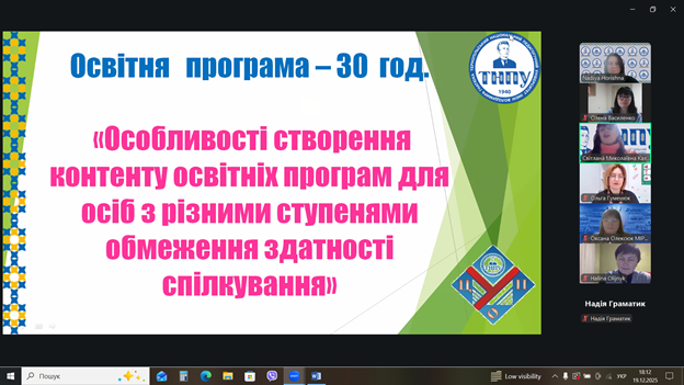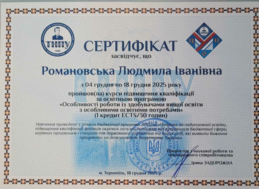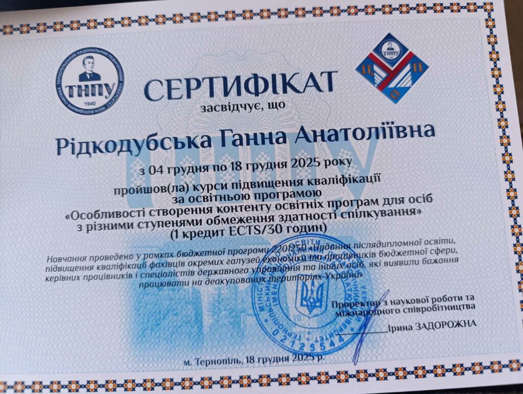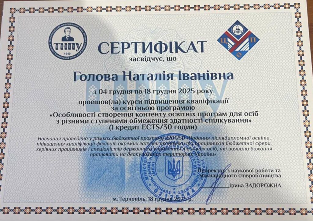 З 04 грудня по 18 грудня 2025 року завідувач кафедри Олена Василенко, професор кафедри Анна Рідкодубська, професор кафедри Людмила Романовська та доцент кафедри Наталія Голова пройшли курси підвищення кваліфікації за такими освітніми програмами: «Особливості роботи із здобувачами вищої освіти з особливими освітніми потребами» та «Особливості створення контенту освітніх програм для осіб з різними ступенями обмеження здатності спілкування».