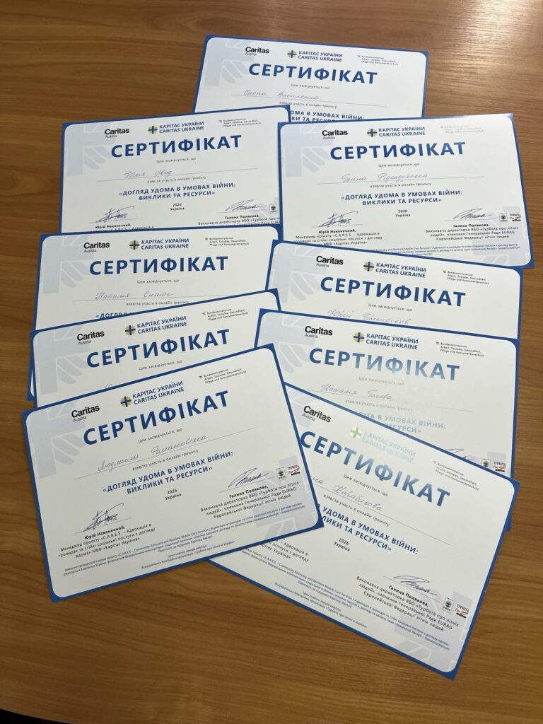 Викладачі та здобувачі кафедри соціальної роботи і соціальної педагогіки за результатами проходження онлайн-тренінгу «Догляд удома в умовах війни: виклики та ресурси», організованому Caritas Ukraine спільно з Caritas Austria, отримали сертифікати, які засвідчили рівень опанування ними теоретичними знаннями і практичними уміннями щодо догляду за людьми літнього віку, особами з інвалідністю та ветеранами в умовах воєнного часу.