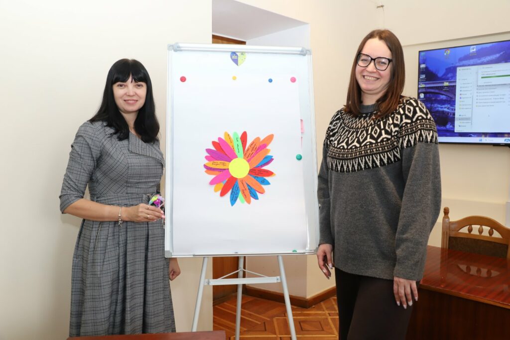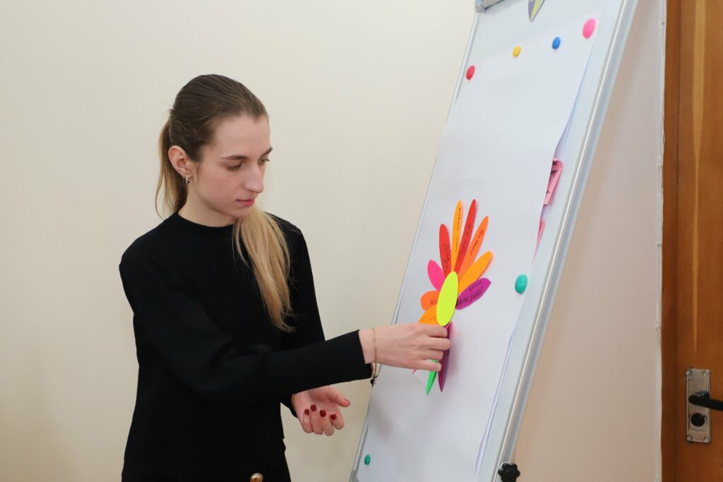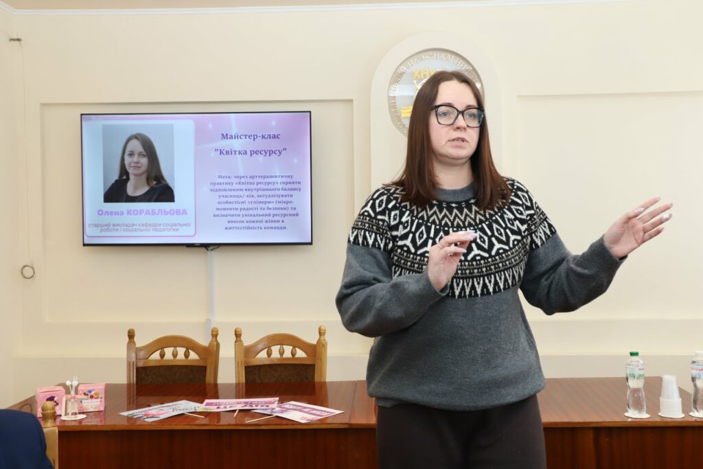 Старший викладач кафедри Олена Корабльова провела захоплюючий майстер-клас «Квітка ресурсів», метою якого було через арттерапевтичну практику сприяти відновленню внутрішнього балансу учасниць, актуалізувати особистісні «глімери» та визначити унікальний ресурсний внесок кожної жінки в життєстійкість команди.