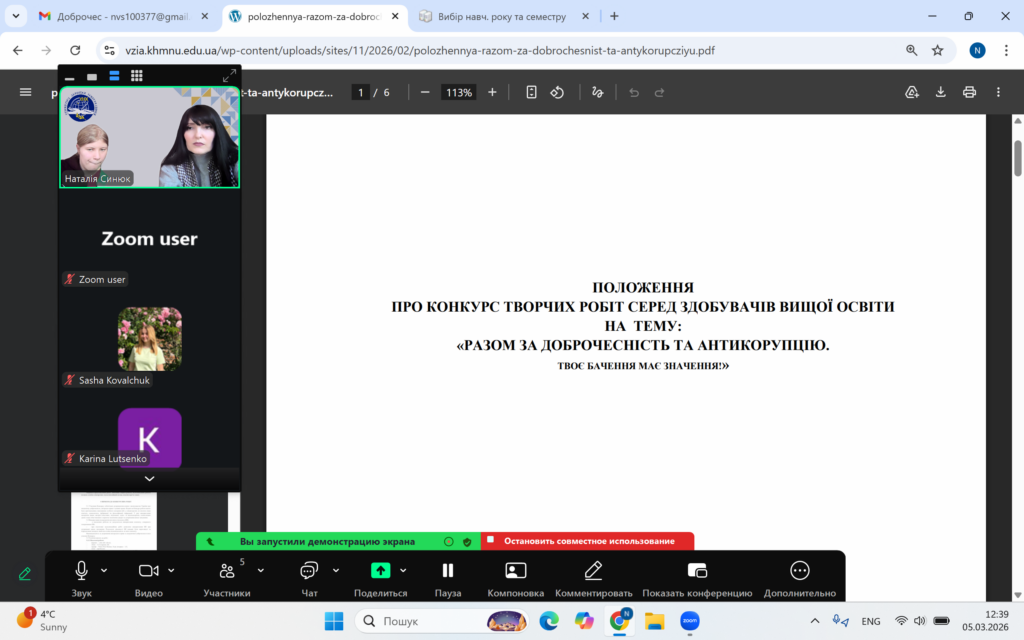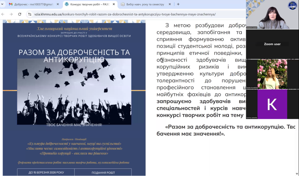 5 березня 2026 року відбулося засідання наукового гуртка «Науковий супровід соціальних проєктів» присвячене підготовці до конкурсу творчих робіт серед здобувачів вищої освіти «Разом за доброчесність та антикорупцію. Твоє бачення має значення», який запроваджено відділом навчально-виховної роботи і відділом забезпечення якості вищої освіти ХНУ.