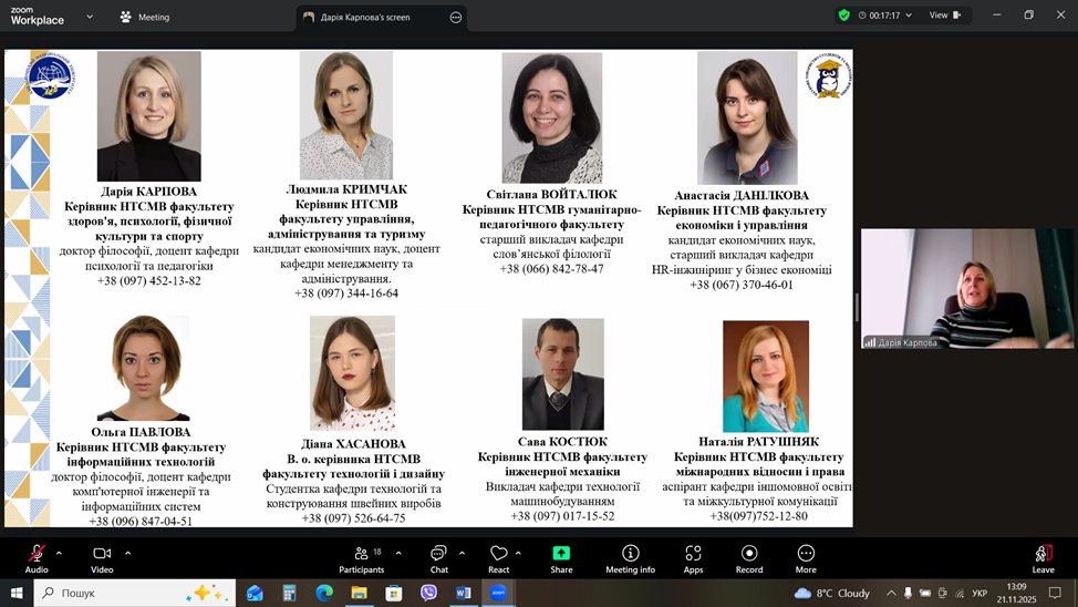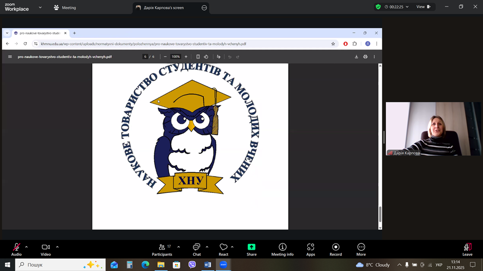 21 листопада 2025 року в межах діяльності студентського наукового гуртка «Інноваційні наукові дослідження в соціальній сфері»(керівник – канд. пед. наук, доцент Олена Василенко) відбулася зустріч із представницею Наукового товариства студентів та молодих вчених Хмельницького національного університету Дарією Карповою.